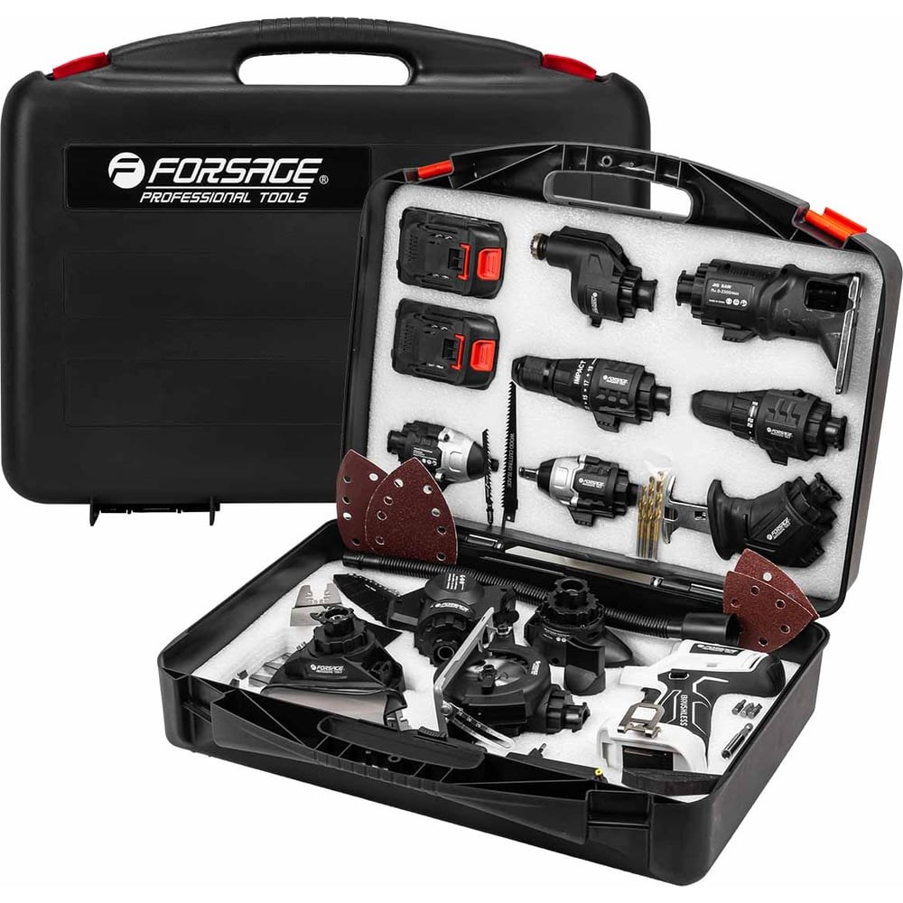 Универсальный инструмент от бренда Forsage, обладающий мощным коллекторным мотором 775 и напряжением 18 В/20 В. Этот инструмент идеально подходит для выполнения различных задач благодаря множеству насадок и аксессуаров.ХарактеристикиСкорость без нагрузки: До 21,000 об/мин.Дисплей питания: Удобный интерфейс для контроля состояния.Переключатель вперед/назад: Легкость в использовании.Насадки и аксессуарыСверлильная насадка:Патрон: 13 мм.Скорость: от 0-350 до 0-1400 об/мин.Крутящий момент: 40 Нм.Включает 6 спиральных сверел, 3 биты и 1 держатель бит.Ударная насадка:Частота ударов: 0-4550/0-18200 в минуту.Крутящий момент: 150 Нм.Скорость без нагрузки: 2700 об/мин.Ударный гайковерт:Крутящий момент: 260 Нм.Скорость удара: до 3400 ударов в минуту.Сабельная пила, лобзик и циркулярная пила:Различные режимы работы для резки и распиловки материалов.Включает лезвия для резки дерева.Специальные насадки:Ножницы-кусторез: Для подстригания кустов и живых изгородей.Насадка для бензопилы: С цепью для удобства работы.Осциллирующий инструмент: Широкий спектр возможностей для обработки поверхностей и материалов.Универсальный инструмент с матовым корпусом — это идеальное решение для выполнения широкого спектра задач, обеспечивая высокую производительность и точность работы.