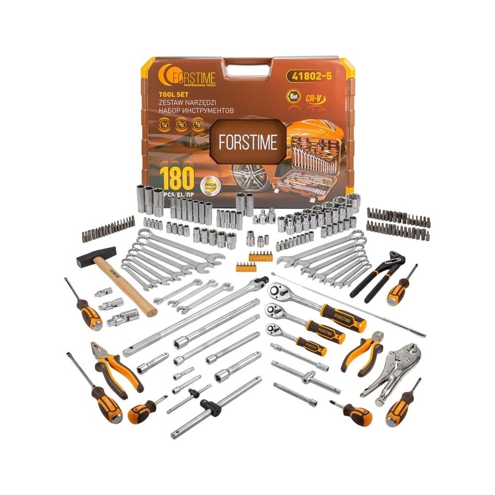 Набор профессиональных инструментов из 180 предметов от бренда FORSTIME применим для ремонта на СТО, мастерских, производствах, в гараже, в дороге, на даче и дома в быту.Качество изготовления. Инструменты выполнены из качественной и предельно прочной высоколегированной стали, чтобы обеспечить долговечность и надежность.Продуманная комплектация. В наборе есть широкий выбор головок, бит и ключей различных размеров, что позволяет использовать его для ремонта многих моделей машин. Посадочный квадрат: 1/4", 3/8", 1/2". Тип головок: 6-гранные, 12-гранные, Е-профиль, короткие, глубокие.Удобство использования. Все инструменты, собраны и хранятся в прочном пластиковом кейсе с металлическими защелками, который легко поместится в багажник вашего автомобиля. Кроме того, этот набор инструментов идеально подходит для использования дома. Будь то небольшой ремонтный проект или крупное строительство, этот комплект поможет вам быстро и легко завершить любую работу.