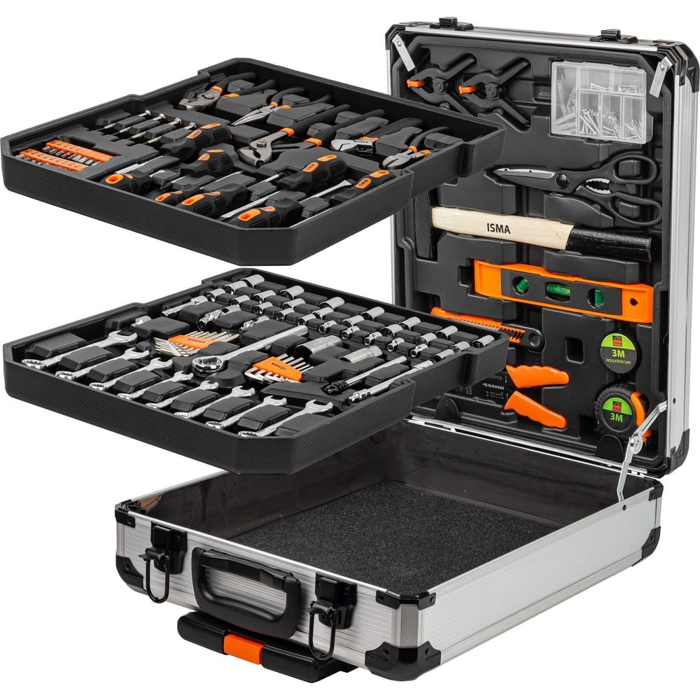 Профессиональный набор инструментов от бренда ISMA TOOLS — это идеальный выбор для выполнения ремонта автомобилей, домашнего использования и работы на даче. Комплект включает всё необходимое для решения разнообразных задач, от мелкого бытового ремонта до обслуживания авто.Универсальность: Включает трещотки, головки различных размеров, ключи, отвертки, плоскогубцы и другие инструменты, подходящие для широкого спектра задач.Надежность: Все инструменты изготовлены из прочной хромванадиевой стали, что гарантирует долгий срок службы и устойчивость к коррозии.Удобство хранения и транспортировки: Набор поставляется в прочном пластиковом кейсе с металлическими защелками и замком, что обеспечивает безопасность и удобное перемещение инструментов.Практичная комплектация: В комплект входят стандартные инструменты, манометр для шин, молоток-гвоздодёр, уровень и рулетка, что делает этот набор особенно полезным для ежедневного использования.Советы по применению:Используйте комбинированные ключи и трещотки для работы с крепежами автомобиля.Набор идеально подходит для создания технических конструкций на даче.