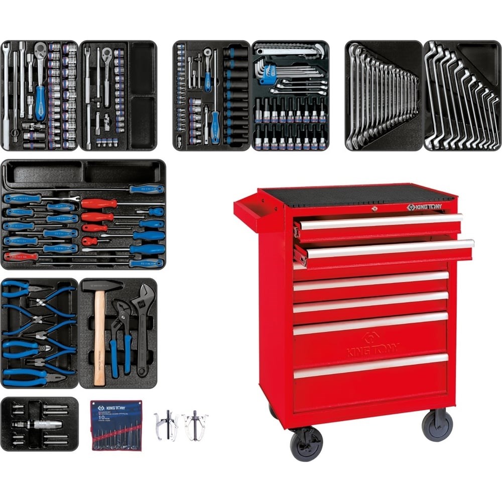 Набор инструментов в красной тележке KING TONY 204 предмета 934-100MR предназначен для профессионального использования в автосервисной мастерской, на станции технического обслуживания, а также на производстве. Комплект состоит из прочных и износостойких инструментов.