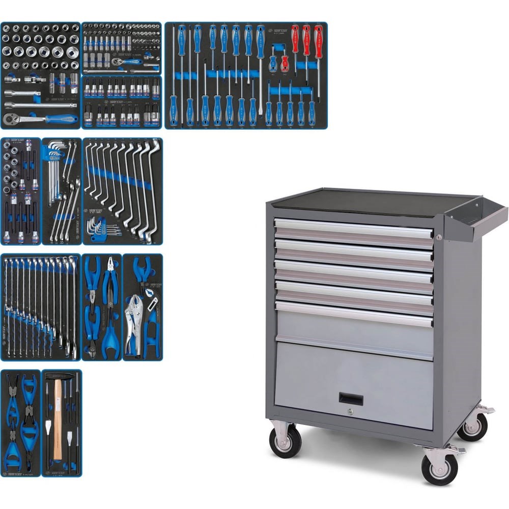 Набор инструментов KING TONY "EFFORT" в серой тележке "Мастак", 235 предметов 934-235AMG представлен в расширенной комплектации. 5 выдвижных ящиков разделены на 12 ложементов стандартных размеров. Благодаря этому предусмотрено размещение наборов в любом варианте. Ложементы изготовлены из EVA - материала, устойчивого к маслам и растворителям. При деформации принимает первоначальную форму. Такие свойства обеспечивают бережное хранение инструмента. В нижней части тележки предусмотрен отсек для хранения дополнительных принадлежнностей.