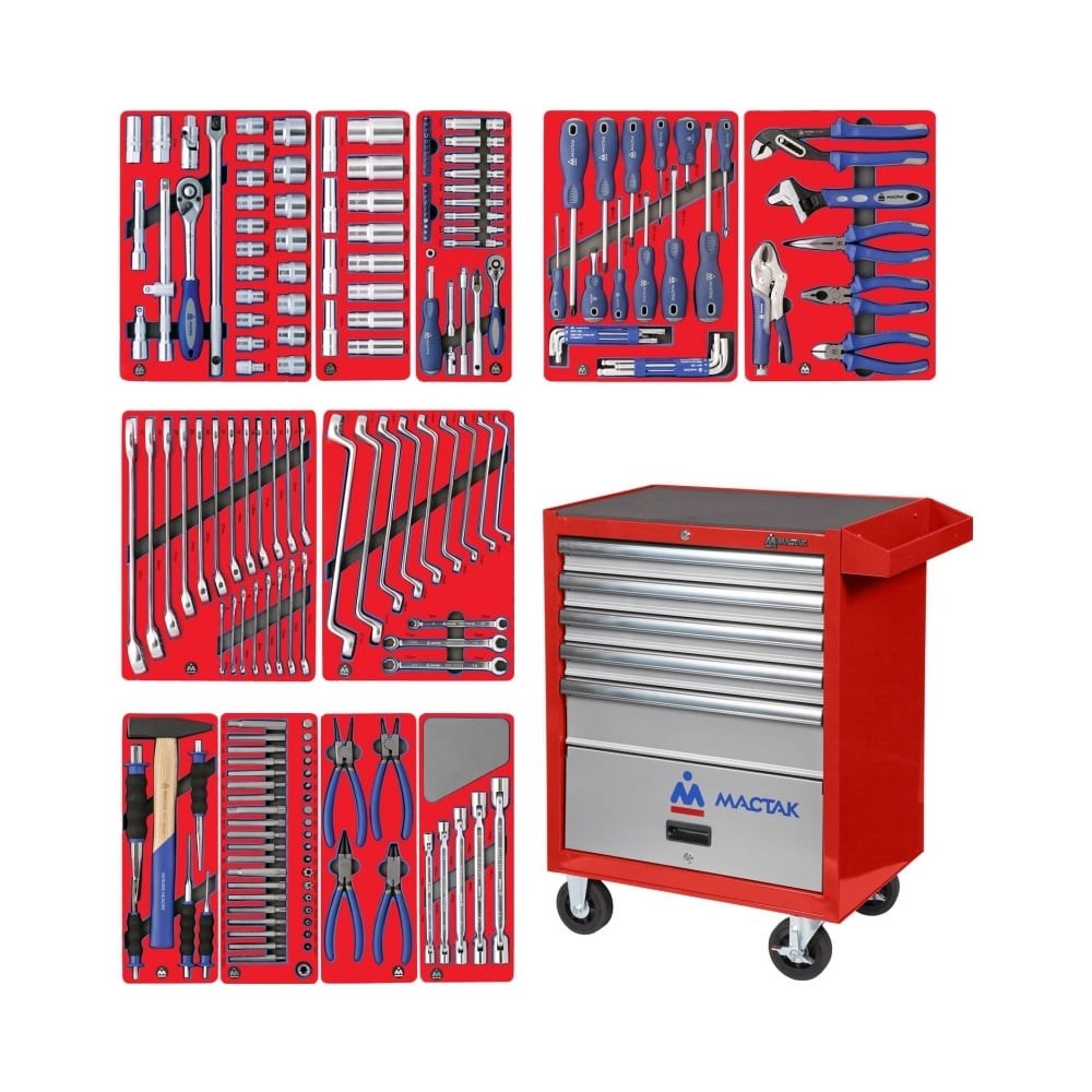 Набор инструментов МАСТЕР 205 предметов МАСТАК 52-05205R в красной тележке распределен по пяти ящикам. Дополнительно имеется отсек для хранения - изначально он пустой. Удобная и простая конструкция обеспечивает комфортное перемещение тележки по полу гаража. Имеется четыре колеса, из них два - поворотные, с тормозом. В верху тележки есть специальное покрытие, которое обеспечивает сохранность покрытия металлической конструкции. Размеры: Полка 1-4: 580 х 406 х 75; Полка 5: 580 х 406 х 150; Отсек для хранения: 580 х 406 х 225.