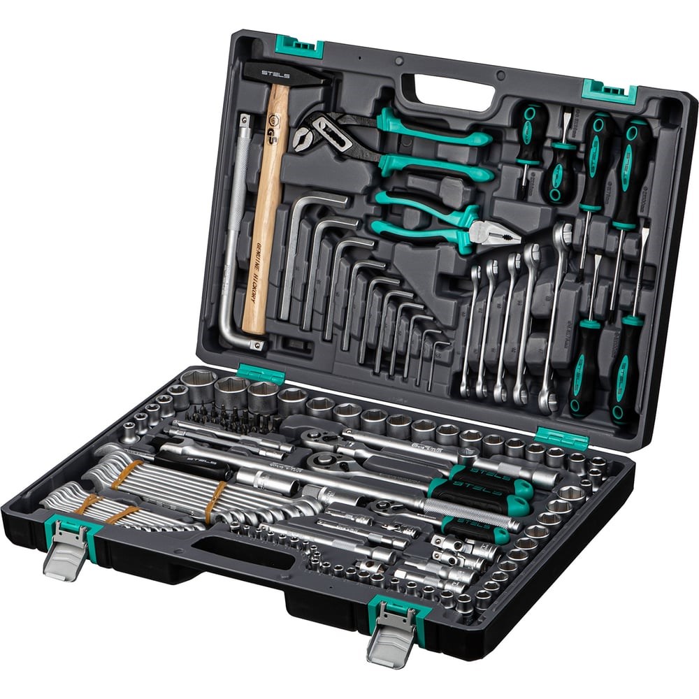Набор инструментов Stels 14107 в пластиковом кейсе включает 142 предмета из стали CrV, с присоединительными размерами 1/2", 1/4" и 3/8", и предназначен для ремонта автомобилей в гараже или автосервисе. Может использоваться в домашних условиях. В комплект входят инструменты для выполнения широкого спектра слесарных работ. Набор упакован в ударопрочный кейс из жесткого пластика и с металлическими застежками, поэтому его удобно хранить и перевозить в багажнике автомашины. Изделия отличаются высоким качеством исполнения и долговечностью в эксплуатации, так как выполнены в соответствии с международными стандартами. Торцевые головки и комбинированные ключи выполнены из хромованадиевой стали, а биты, биты-вставки и отвертки - из стали S2. Дополнительно в комплекте предусмотрены трещоточные ключи с функцией быстрого сброса вставки и реверсивным механизмом. Трещотки имеют 72 зуба, шаг зуба - 5 градусов.