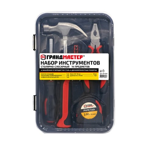 Набор инструментов столярно-слесарный, 14 предметов, пластиковый бокс, ГРАНДМАСТЕР, 671324