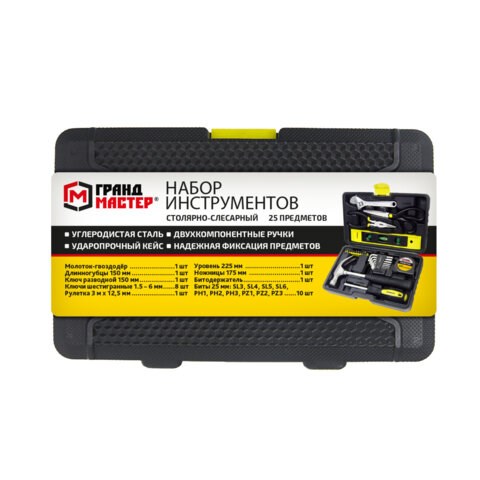 Набор инструментов столярно-слесарный, 25 предметов, пластиковый кейс, ГРАНДМАСТЕР, 671337