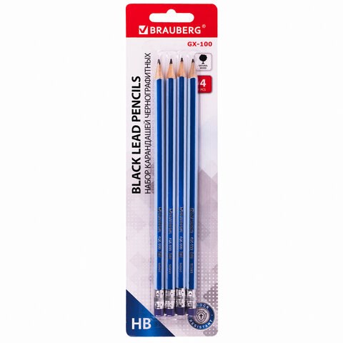 Набор карандашей чернографитных BRAUBERG "GX-100" 4 шт., HB, с ластиком, корпус синий, 181721