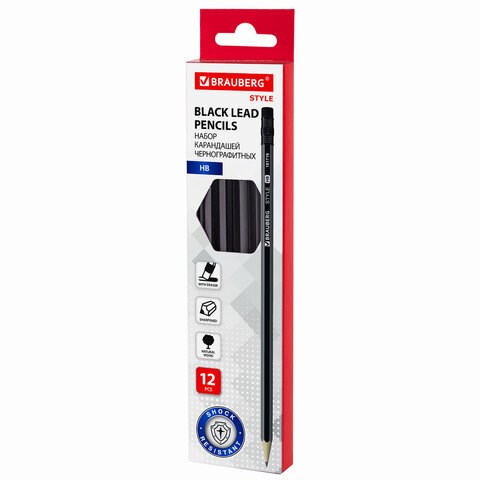 Набор карандашей чернографитных BRAUBERG "Style" 12 шт., HB, с ластиком, корпус черно-серый, 181719