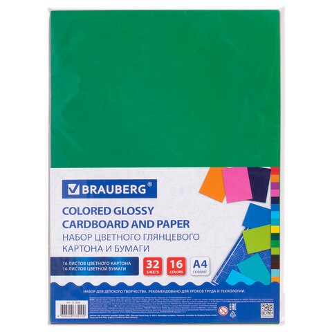 Набор состоит из 16 листов мелованного (глянцевого) картона и 16 листов мелованной (глянцевой) бумаги. 16 разнообразных цветов картона и 16 цветов бумаги надолго обеспечат ребенка всем необходимым для творческого процесса. Цветная бумага имеет плотность 80 г/м2, а картон - 200 г/м2, что позволит создать качественную и яркую поделку. Формат А4 позволит удобно разместить набор в рюкзаке/ранце или папке.