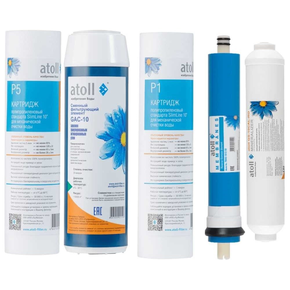 Набор картриджей atoll №102m STDA – это полный комплект сменных фильтрующих элементов для пятиступенчатых систем обратного осмоса atoll А-550m STDA.В составе комплекта:префильтр механической очистки 5 мкм atoll P5;угольный префильтр atoll GAC-10;префильтр механической очистки 1 мкм atoll P1;обратноосмотическая мембрана atoll TW40-1812-50;угольный постфильтр-минерализатор atoll GS-10CAL-RO.Рекомендуемая периодичность замены префильтров и постфильтра: 6 месяцев.Рекомендуемая периодичность замены мембраны: 24-30 месяцев.
