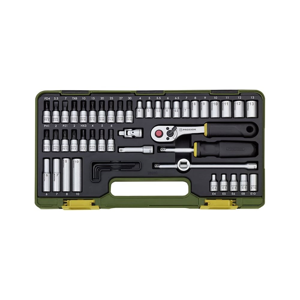 Набор ключей для точного механика 1/4", 49 поз. 23280 Proxxon Технические характеристики: В наборе из 50 предметов торцевые головки размера 4– 13 мм - удлиненные головки для выступающих болтов (на 6-10 мм) -отверточные наконечники для различных типов винтов (плоские, крестовые, шестигранные и ТХ-звездочки), головки для внешней звездочки размерами E4 – E10 - два удлинителя и удлинитель с ползунком. Отверточная рукоятка и 5 шестигранных ключей (1,25 – 3 мм).