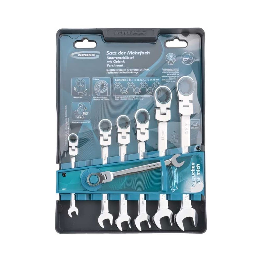 Набор комбинированных ключей 7шт. GROSS 14891 - комплект из семи инструментов для раскручивания и закручивания болтов и гаек. Каждый ключ оснащен храповым механизмом и шарниром для возможности работы в труднодоступных местах. Размеры ключей 8-19 мм. Благодаря тому, что они изготавливаются из хром-ванадиевой стали 40CrV1 и имеют хромоникелевое покрытие, обеспечивается их надежность в работе.