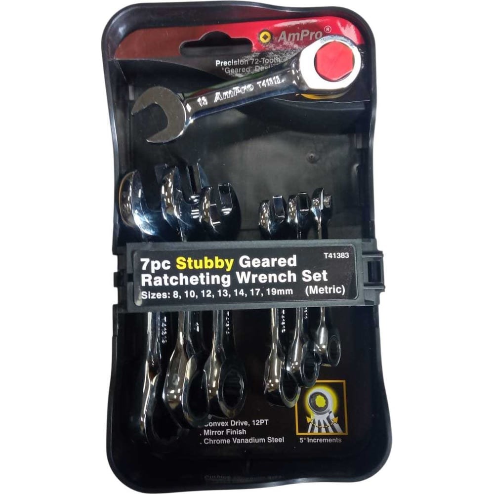 Набор комбинированных трещоточных укороченных ключей AmPro 7 предметов 8-19 мм T41383 упрощает работу с крепежом. Благодаря прочной стали инструмент выдерживает значительную нагрузку - можно вращать тугой крепеж. Головки точно соответствуют размерам. Это исключает люфт и последующее повреждение крепежа или инструмента.