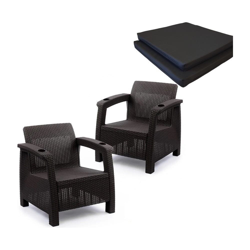 Набор состоит из двух кресел серии «Ротанг». Кресло произведено из высококачественного полипропилена, имитирующего плетение из ротанга. Кресло имеет одно посадочное место, допустимая нагрузка на одно посадочное место - 106 кг. На подлокотниках дивана расположены отверстия для напитков. Кресло может стать идеальным решением по оформлению зоны отдыха в доме, на садовом участке, в офисном помещении или в кафе. Благодаря цветовым решениям, кресло подойдет под любой интерьер. Кресло упаковывается в индивидуальную упаковку, инструкция по сборке прилагается. Зону отдыха также можно дополнить журнальным столиком и диванами серии «Ротанг». Подушки черного цвета для сидения в комплекте выполнены из прочного и водоотталкивающего материала Оксфорд 600. Мебель предназначена для использования внутри и снаружи помещения.