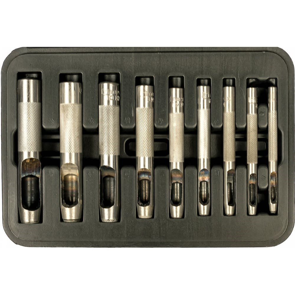 Пробойники 9 шт. TOPEX 03A490 служат для вырубки круглых отверстий 3-12 мм в пластике, деревянных породах, коже, резине и других мягких материалах. Инструмент изготовлен из легированной стали, которая обеспечивает устойчивость к повышенным нагрузкам и деформации. Для удобного хвата на ручки нанесена накатка, таким образом, руки не соскальзывают во время работы.