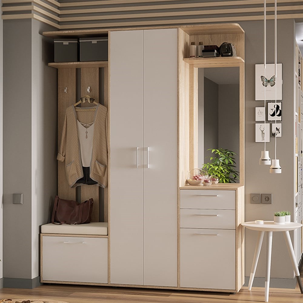 Набор мебели для прихожей "Витра" тип 2 - это идеальный вариант обустройства небольшой прихожей для тех, кто предпочитает максимальную функциональность и эстетичность мебели. Благодаря компактности и продуманной конструкции, наша новинка займет минимальное пространство в комнате, обеспечив при этом удобство и комфорт. Дизайн. Гармоничная комбинация светлых текстур с лицевой фурнитурой актуального цвета, способна стать ярким акцентом, задающим неповторимый тон не только мебели, но и всему пространству комнаты. Функциональность. При своей небольшой глубине прихожая "Витра" является функциональной мебелью, ведь в ее конструкции предусмотрен не только закрытый шкаф с выдвижной штангой, но и открытая секция с крючками, выдвижные ящики и закрытые ниши, в которых можно спрятать от посторонних глаз все необходимые предметы. Место для сидения можно дополнить мягким элементом в обивке из экокожи, который преобразит общий образ модели. Внимание! Мягкий элемент в комплект не входит, приобретается отдельно.