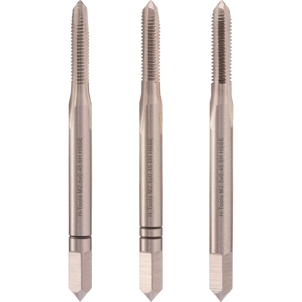 Набор метчиков из 3-х шт. H-Tools предназначен для создания внутренней метрической резьбы с углом профиля 60 градусов в различных материалах. Изготовлен из высококачественной быстрорежущей стали HSSE-Co5(Кобальт 5%), которая гарантирует прочность и износостойкость. Подходит для обработки заготовок, выполненных из легированной и нержавеющей стали, чугуна, алюминия, меди, бронзы, цинка, с пределом прочностью до 1000MPa. Формирование резьбы происходит в 3 этапа: сначала черновым метчиком №1 (6-8 ниток на заход), затем чистовым №2 (4-5 ниток на заход) и финишным (2-3 нитки на заход). Благодаря этому, снижается усилие, прилагаемое к каждому метчику, а получаемая резьба более точная и чистая.