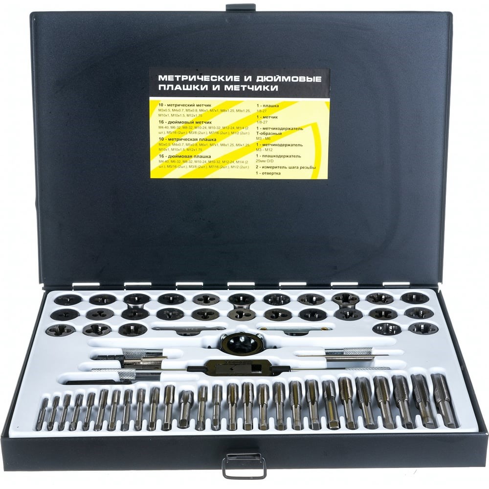 Набор метчиков и плашек ЭВРИКА метрический и дюймовый 60 предметов ER-00603 подойдет для нарезания резьбы. Несколько типовых размеров оптимальны для работы с металлом. Инструмент выполнен из прочной стали, что обеспечивает качественную резку.