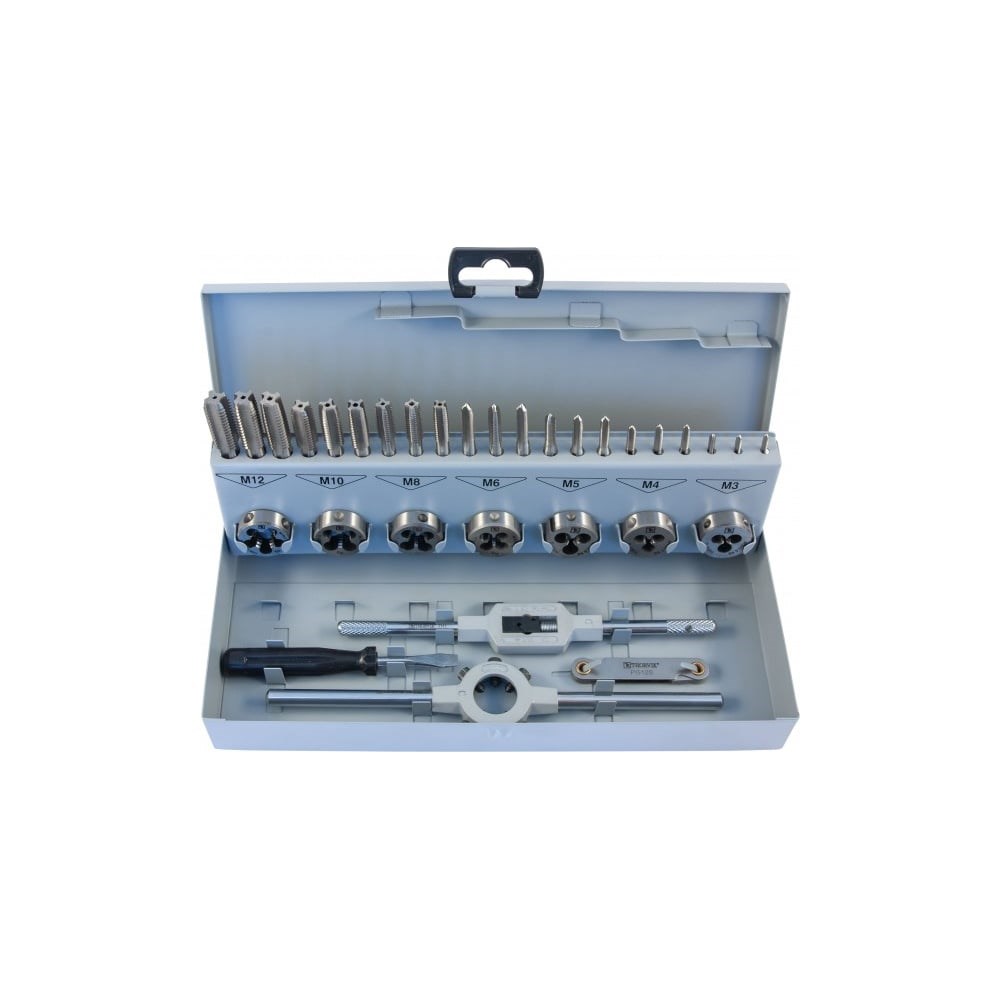 Набор трехпроходных метчиков и круглых плашек THORVIK COMBO М3-М12, HSS-G, 32 предмета MTDS32 52887 представлен в оптимальной комплектации с популярными типоразмерами моделей. Поставляется в железном кейсе. Это обеспечивает надежное хранение и защищает инструмент от механических повреждений.