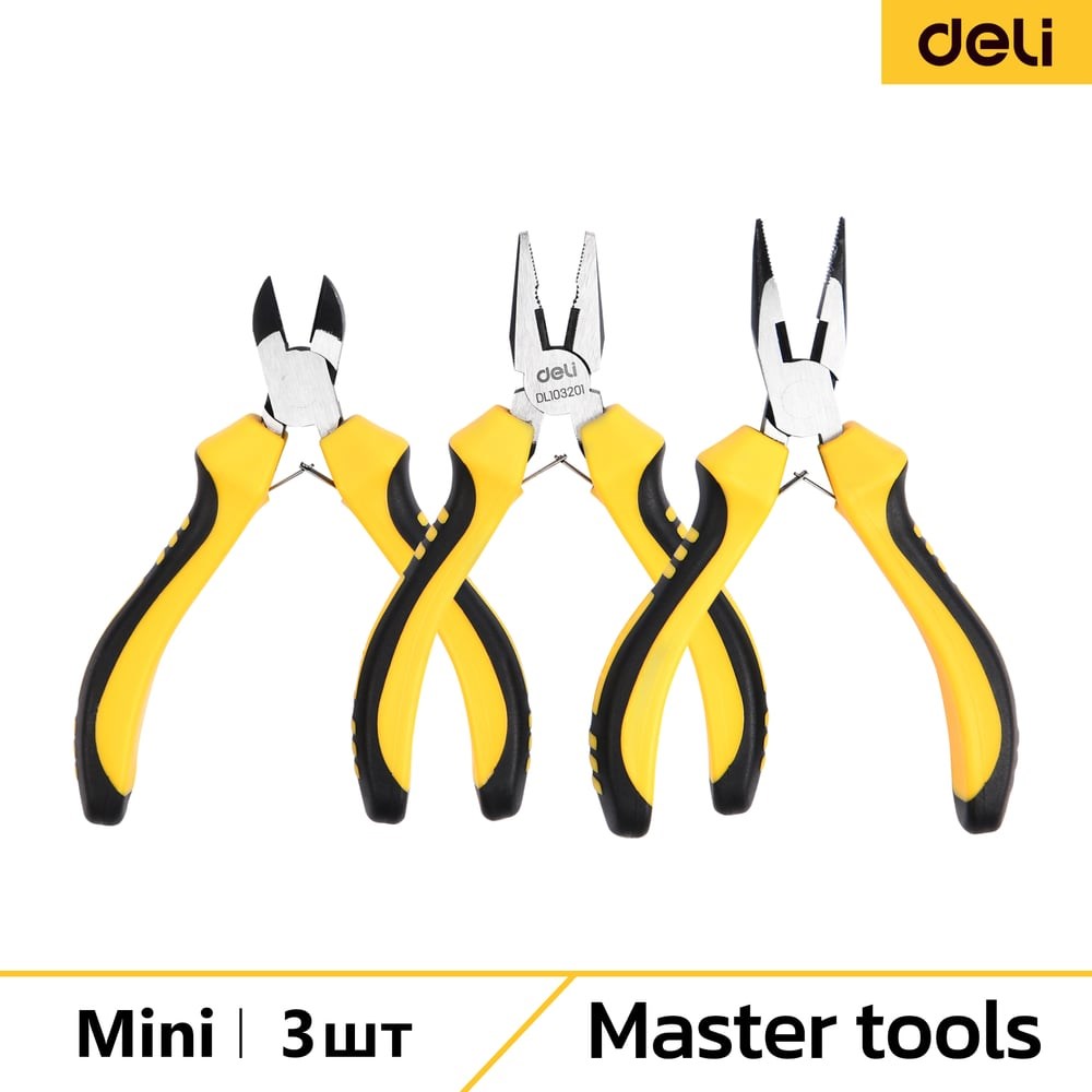 Набор мини-плоскогубцев Deli DL103201-3 (комбинированные 115мм, удлиненные 125мм, бокорезы 110мм, двухкомпонентная ручка)