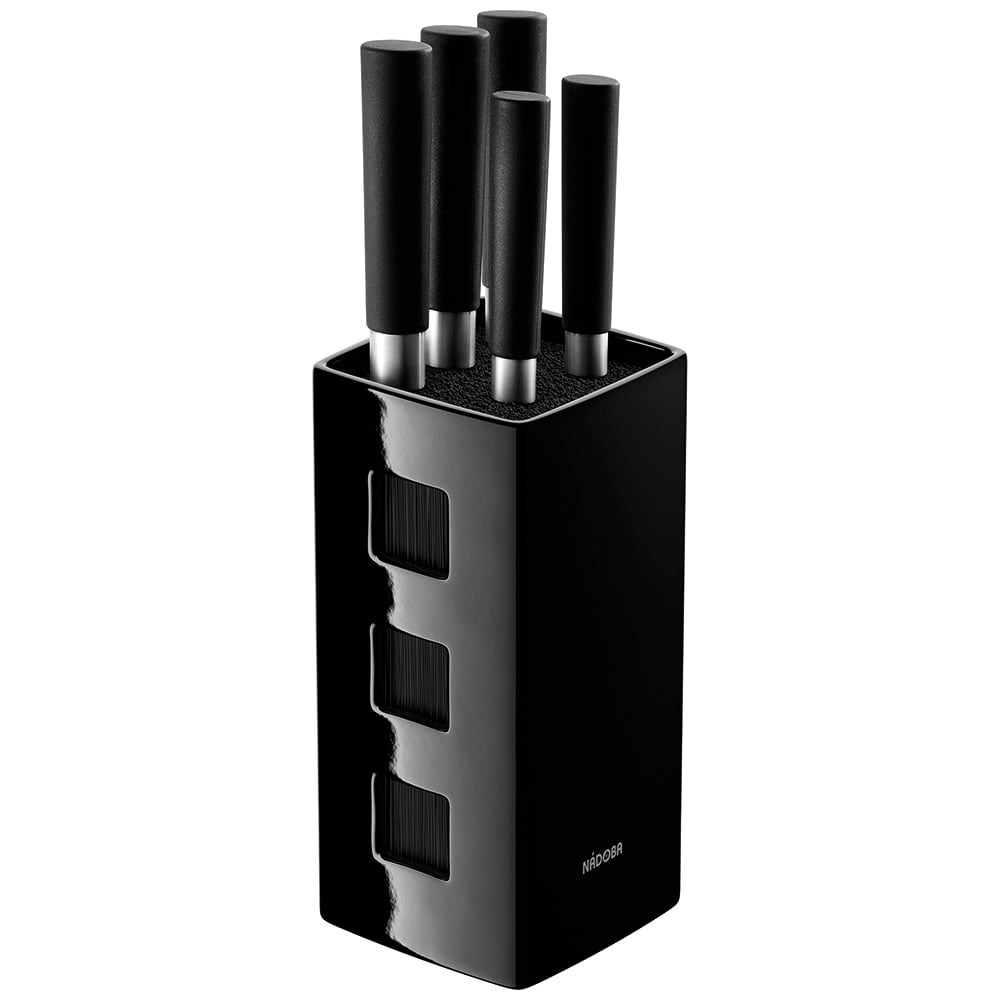 Набор кухонных ножей NADOBA серии Keiko включает в себя 6 предметов: удобную подставку для ножей из высококачественной керамики и комплект из 5 ножей для разного применения: нож для овощей (длина лезвия - 8 см); нож Сантоку (длина лезвия - 12,5 см); нож Сантоку с углублениями (длина лезвия - 17,5 см); разделочный нож (длина лезвия - 21 см); поварской нож (длина лезвия - 20,5 см). Все лезвия ножей выполнены из нержавеющей стали, за счет пятигранного профиля лезвий стальные ножи отличаются высокой прочностью режущей кромки, качественным резом и простотой заточки. Эргономичные ручки металлических ножей с гладкой поверхностью удобно лежат в руке во время использования, не скользят и легко моются. Материал ручек ножей – специальный высококачественный пластик, устойчивый к механическим воздействиям. В набор входит универсальный блок для ножей без прорезей, позволяющий хранить ножи разного назначения в любом количестве и произвольном порядке. Внутренняя вставка из пластиковых волокон легко вынимается и моется, тем самым обеспечивая чистоту рабочего пространства. Гигиеничность места хранения ножей достигается в том числе за счет натурального материала подставки – керамики, обладающей антибактериальными свойствами и устойчивостью к воздействию влаги и солнечных лучей.