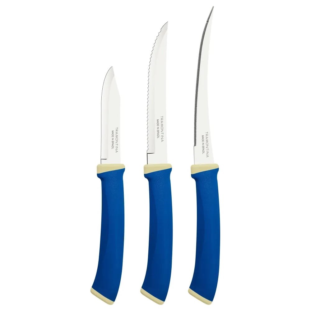 Удобный и практичный набор ножей Tramontina Felice для повседневного использования, который просто необходим на каждой кухне! В наборе маленький нож для очистки овощей (7.5см) и два ножа с лезвием 12.5 см с зубцами (для мяса) и микрозубчиками для томатов, цитрусовых и других мягких продуктов.Ножи с зубчатым лезвием очень удобны для нарезки хлеба, стейков, замороженных продуктов, сыра, помидоров. Позволяют легко нарезать продукты с твердой кожицей и нежной мякотью, не помяв мягкой сердцевины. Нож с волнистым лезвием не требует заточки, служит десятилетиями. Лезвия ножей из нержавеющей стали марки AISI 420, которая прошла термическую обработку и поэтому обладает повышенной прочностью - т.е. требует более редкой правки и заточки, что обеспечивает более долгий срок службы по сравнению с изделиями из аналогичной стали других производителей. И к тому же не боится коррозии, не абсорбирует запахи, предотвращает размножение бактерий. Полипропиленовые ручки не скользят и благодаря эргономичной форме удобно лежат в руке.