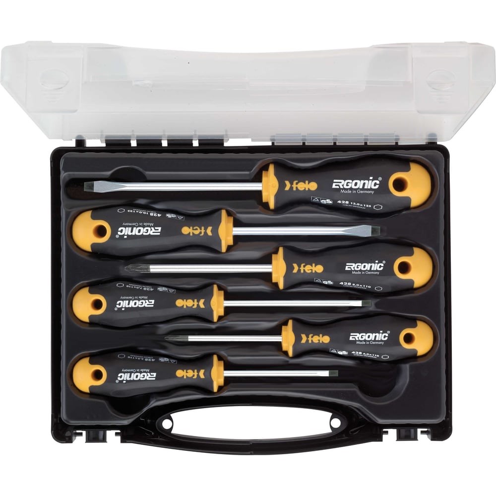 Набор отверток 6 шт в кейсе Felo Ergonic 40020636 используется при монтажных, демонтажных, ремонтных работах с крепежными соединениями, имеющими прямой и крестообразный шлиц. Рукоятки из двухкомпонентного пластика не скользят в руке и произведены по инновационной технологии ERGONIC, благодаря которой адаптируются к форме руки пользователя. Стержни отверток выполнены из хром-молибден-ванадиевой стали, благодаря чему их износостойкость значительно превышает установленные технические требования.