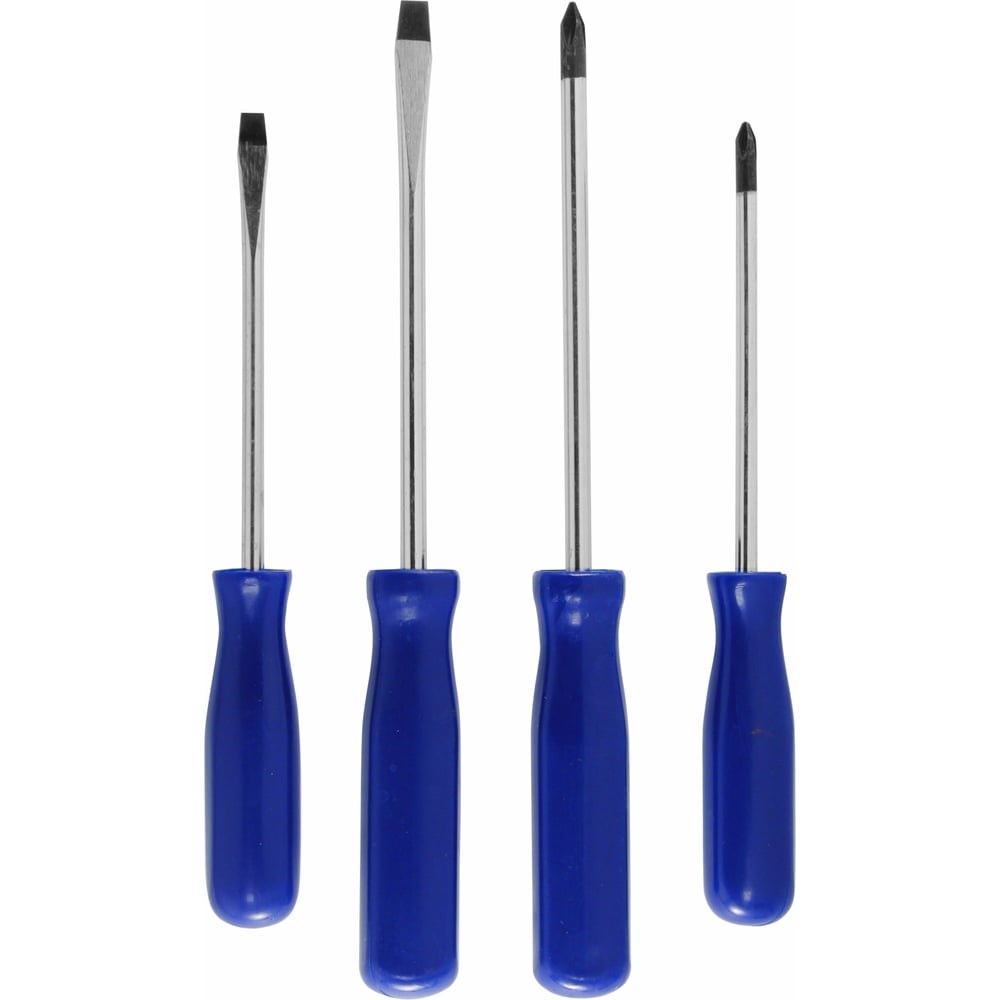 Набор отверток KROFT, 4 штНабор из 4 наиболее используемых в быту отвертки. Пластиковая рукоятка удобно лежит в руке, не натирает ладонь при использовании и легко очищается при загрязнении. Стержень изготовлен из высококачественной легированной стали устойчивой к износу и истиранию с намагниченным наконечником. Геометрия жала соответствует промышленным стандартам. Рукоятка выполнена из пластикаРР. Форма рукоятки создает дополнительную опору при необходимости увеличения крутящего момента. Характеристики:Типы шлицов: плоский, крестообразныйОтвертка №1: жало PH1 (4.5/4 мм), длина жала 100 ммОтвертка №2: жало PH2 (5 мм), длина жала 125 ммОтвертка №3: жало SL4 (0.8 мм), длина жала 100 ммОтвертка №4: жало SL (1.2 мм), длина жала 125 ммМатериал жала: CS45Твердость (HRC): 48-52Материал рукояти: полипропилен (PP)Особенность: магнитный наконечникКоличество в упаковке (шт): 4