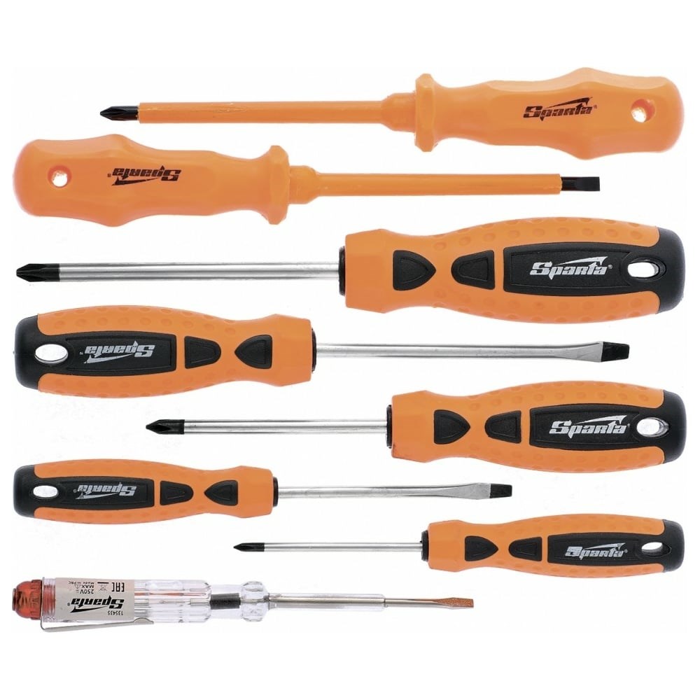 Набор отверток SPARTA 135435 используется для монтажа резьбовых соединений. В комплекте пять отверток PH, SL, две диэлектрических отвертки и отвертка-пробник для работ под напряжением до 220 В. Имеют удобную рукоятку. Стержень намагничен.