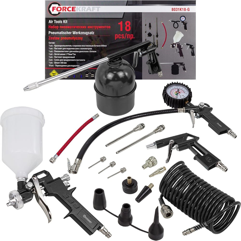 Набор пневмоинструментов FORCEKRAFT (18 предметов) — универсальный комплект, объединяющий всё необходимое для выполнения широкого спектра задач: от покрасочных и очистительных работ до мойки двигателя и подкачки шин. Идеален как для профессионального применения в СТО и мастерских, так и для продвинутых автолюбителей.Преимущества:Прочная металлическая конструкция — повышенная износостойкость и долгий срок службы;Многофункциональность Включает инструменты для подкачки шин, мойки двигателя, продувки, покраски — охватывает широкий спектр задач в автосервисе и гараже.Эффективная очистка двигателя Пневмопистолет для мойки обеспечивает быструю и безопасную очистку труднодоступных зон под капотом.Точная продувка Продувочный пистолет с двумя соплами (110 и 140 мм) обеспечивает доступ к узким и глубоким участкам, удаляя пыль и загрязнения.Универсальные переходники 10 переходников для подкачки позволяют работать с различными типами шин и клапанов.Гибкие шланги Шланг витой 5×8 мм длиной 5 м и дополнительный шланг 360 мм обеспечивают свободу перемещения и удобство подключения.Контроль давления Пистолет для подкачки оснащён манометром, что позволяет точно контролировать давление в шинах и избежать перекачки.Качественная покраска Краскораспылитель позволяет наносить равномерное покрытие, снижая расход краски и повышая качество отделки.Подходит для любых условий — от гаража до промышленного использования.