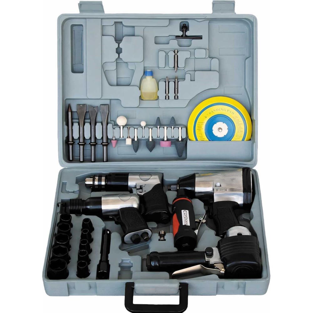 В набореударный гайковёрт, виброшлифовальная машинка, пневмомолоток, шлифовальная машинка, дрель реверсивная и 38 предметов оснастки