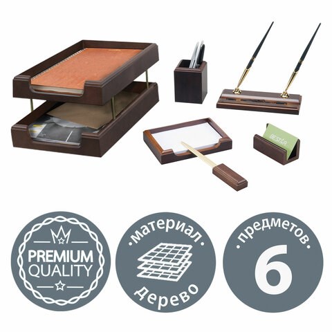 В составе комплекта следующие предметы: - используемый для сортировки бумаг A4 формата двойной лоток; - подставка для ручек (2 шариковые ручки в комплекте); - стакан под ручки, грифельные карандаши; - нож для вскрытия конвертов; - подставка под листы для записей; - визитница. Для изготовления набора использованы дерево в цвете "орех" и металл. Выдержан в лаконичном цвете. Представленный комплект относится к премиальному ценовому сегменту.