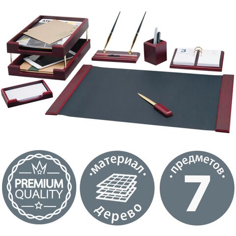 Набор состоит из 7 универсальных предметов: - коврик для письма (размер – 60х42 см) - двойной лоток (для бумаг формата А4); - подставка для ручек (2 шариковые ручки в комплекте); - стакан-подставка для письменных принадлежностей и канцелярских мелочей; - нож для вскрытия конвертов; - подставка под листы для записей (листы в комплекте); - подставка для перекидного календаря. Все предметы изготовлены из дерева в красном цвете с золотистой фурнитурой. Набор упакован в подарочную коробку, а также дополнительно в защитный гофрокорб для транспортировки. Представленный комплект относится к премиальному ценовому сегменту.
