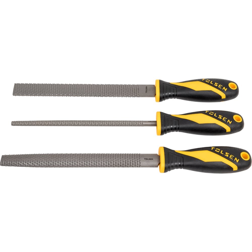 Изготовлены из специальной инструментальной стали. Двухкомпонентные рукоятки. Состав набора: плоский, полукруглый, круглый рашпили. Упаковка: блистер