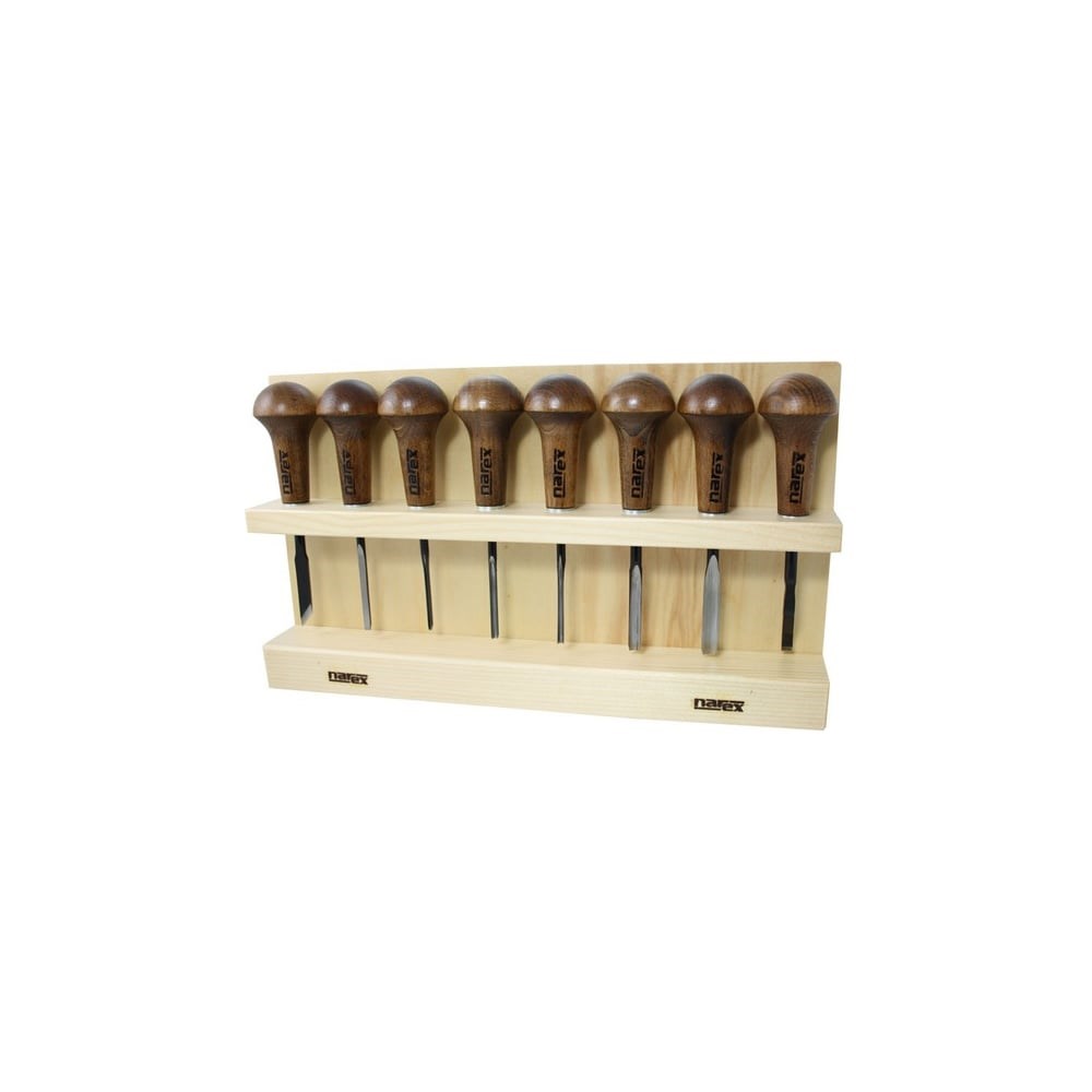 Набор из 8 резцов с деревянной ручкой в деревянной подставке NAREX Profi 868700 - ручной инструмент высокого качества, который станет надежным помощником для профессиональных мастеров в области резки по дереву. Каждый компонент оснащен прочным лезвием из инструментальной хром-ванадиевой стали с термической обработкой до твердости 61-62 HRc. Ручки резцов удобны в обхвате, они выполнены из древесины, поверхности защищены восковым покрытием.