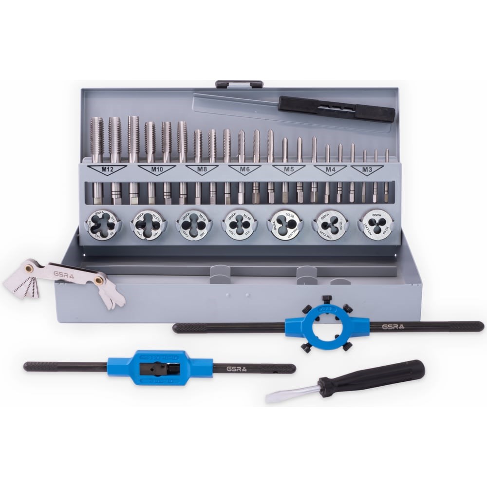 Набор ручных метчиков и плашек GSR 25х9 M3-M12 HSSG 32 предмета 00708070 предназначен ддля метрической ISO-резьбы М состоит из комплектных метчиков DIN 352, круглых плашек стандарта 25х9 мм, держателей инструмента для метчиков и плашек. Материал обработки - нелегированные углеродистые стали, с пределом прочности до - 800 Н/мм2. Автоматные стали, деформируемые латуни, алюминиевые сплавы - кремний более 10%, цинковые сплавы, медные сплавы, бронза. Наборы метчиков DIN 352 состоят из трех метчиков - первый (черновой метчик) маркирован одним кольцом, длинная заборная часть, Форма А / 6-8 витков. Средний (получистовой) маркирован двумя кольцами, средняя заборная часть, Форма D / 3,5-5 витков. Третий (чистовой) без маркировки, короткая заборная часть, Форма С / 2-3 витка. DIN 352 = Немецкий институт по стандартизации, M = размер в мм для метрических ISO2-резьб в соответствии с DIN 13, 6H = класс точности по DIN 802, часть 1, HSS = быстрорежущая сталь группы сплавов HSS, Вид отверстия:сквозное / глухое. Плашки круглые для метрической ISO-резьбы М форма В. 25х9 мм заводской стандарт, В= форма плашки (с угловым пазом) M = размер в мм для метрических ISO2-резьб в соответствии с DIN 13, 6g = класс точности по DIN 802, часть 1, HSS = быстрорежущая сталь группы сплавов HSS, Направление резьбы: правое.