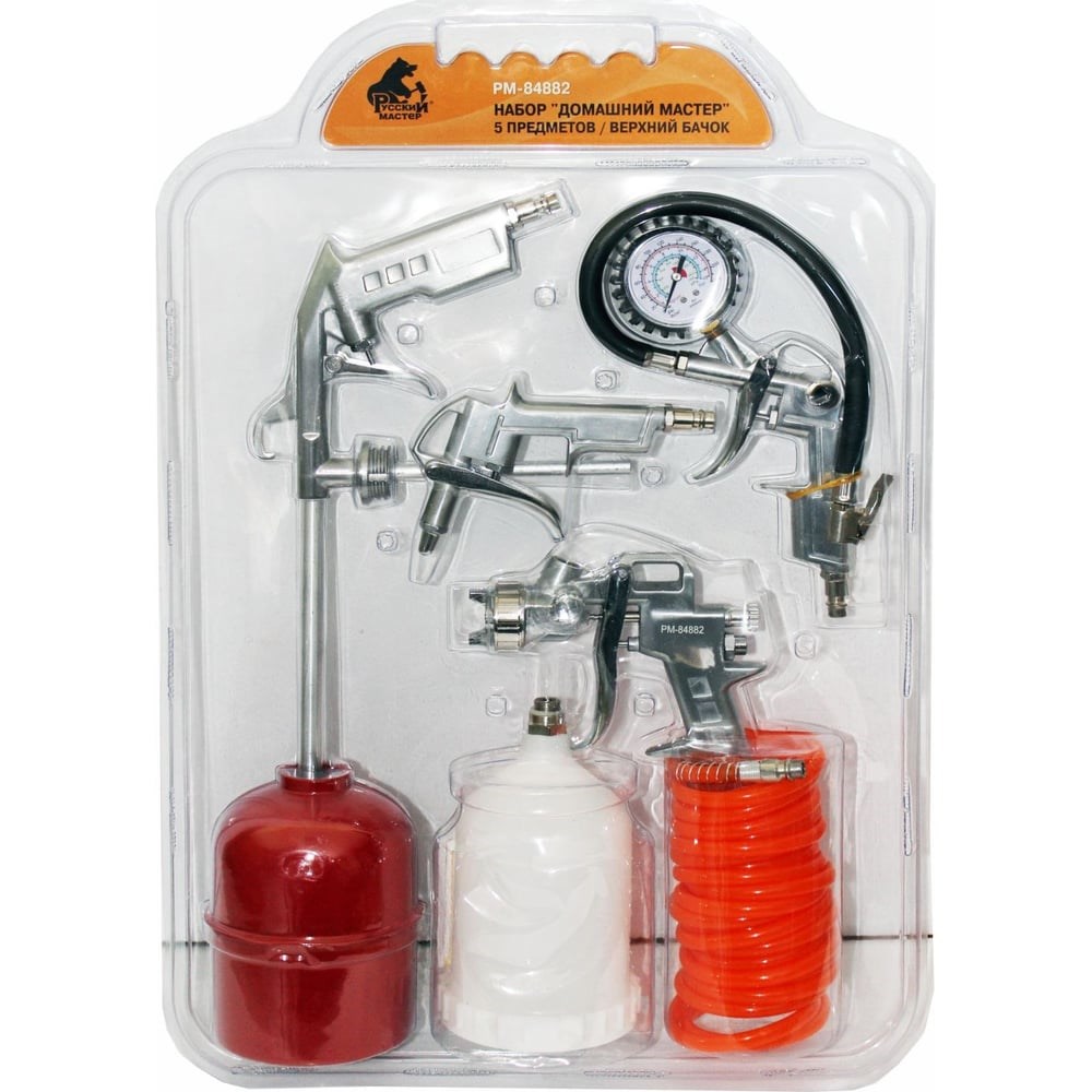 Набор пневмоинструмента «Домашний Мастер» РМ – 84882 предназначен для лакокрасочных работ, продувки загрязненных поверхностей сжатым воздухом, подкачки шин, нагнетания технических жидкостей и антикоррозийных составов. Корпуса изготовлены из металла, что позволяет добиться высокой надежности и длительного срока службы. Набор подходит для работы как в домашних условиях, так в автосервисах и предприятиях. Набор включает в себя 5 предметов: краскораспылитель, продувочный пистолет, промывочный пистолет, пистолет для накачки шин и спиральный шланг. Краскопульт выполнен из прочного и качественного алюминиевого сплава, который гарантирует его устойчивость к изнашиванию и увеличивает срок эксплуатации. Дополнительные характеристики: Краскораспылитель с верхним бачком: Сопло: 1,5мм Рабочее давление: 2-5 бар Объем бачка: 500 мл Расход воздуха: 75-280 л/мин Соединение: Быстросъемное Продувочный пистолет: Рабочее давление: 2-8 атм Расход воздуха: 400 л/мин Соединение: Быстросъемное Моющий пистолет: Рабочее давление: 2-4 атм Расход воздуха: 200-400 л/мин Соединение: Быстросъемное Пистолет для подкачки шин: Максимальное давление: 8 атм Соединение: Быстросъемное Шланг воздушный спиральный: Максимальное давление: 10 атм Длина: 5 м Диаметр: 5 мм (внутренний), 8 мм (внешний) Соединение: Быстросъемное