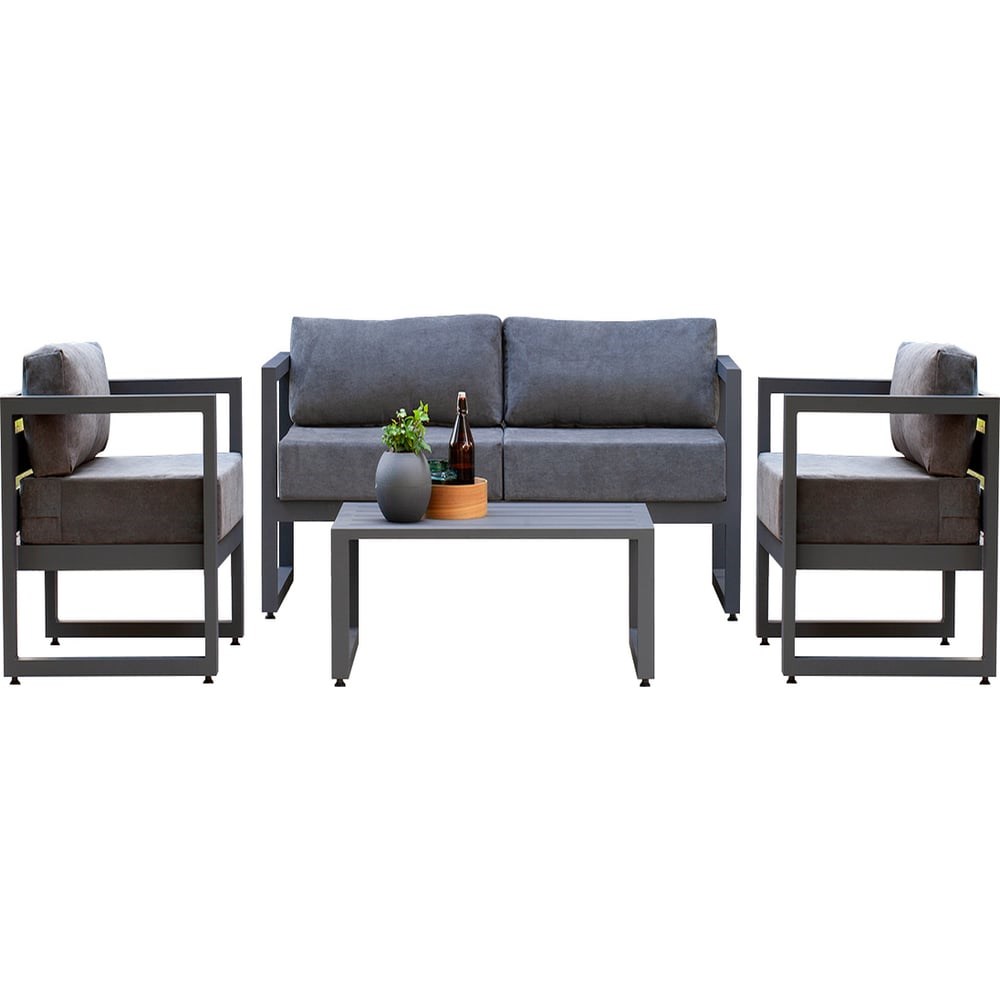 В наборе садовой мебели CAPRI представлены диван, 2 кресла и журнальный столик. Каркас мебели выполнен из высокопрочного алюминия, на сиденьях предусмотрены удобные подушки темно-серого оттенка. Стильный уличный комплект подойдет для размещения пяти человек. Алюминиевая мебель отличается долгим сроком службы, подходит для сада и террасы. Комплект мебели органично впишется в интерьер загородного дома, клуба, ресторана, отеля. Набор доставляется в собранном виде в надежной упаковке.