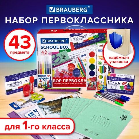 Набор школьных принадлежностей в подарочной коробке BRAUBERG "ПЕРВОКЛАССНИК 43 предмета", 880949