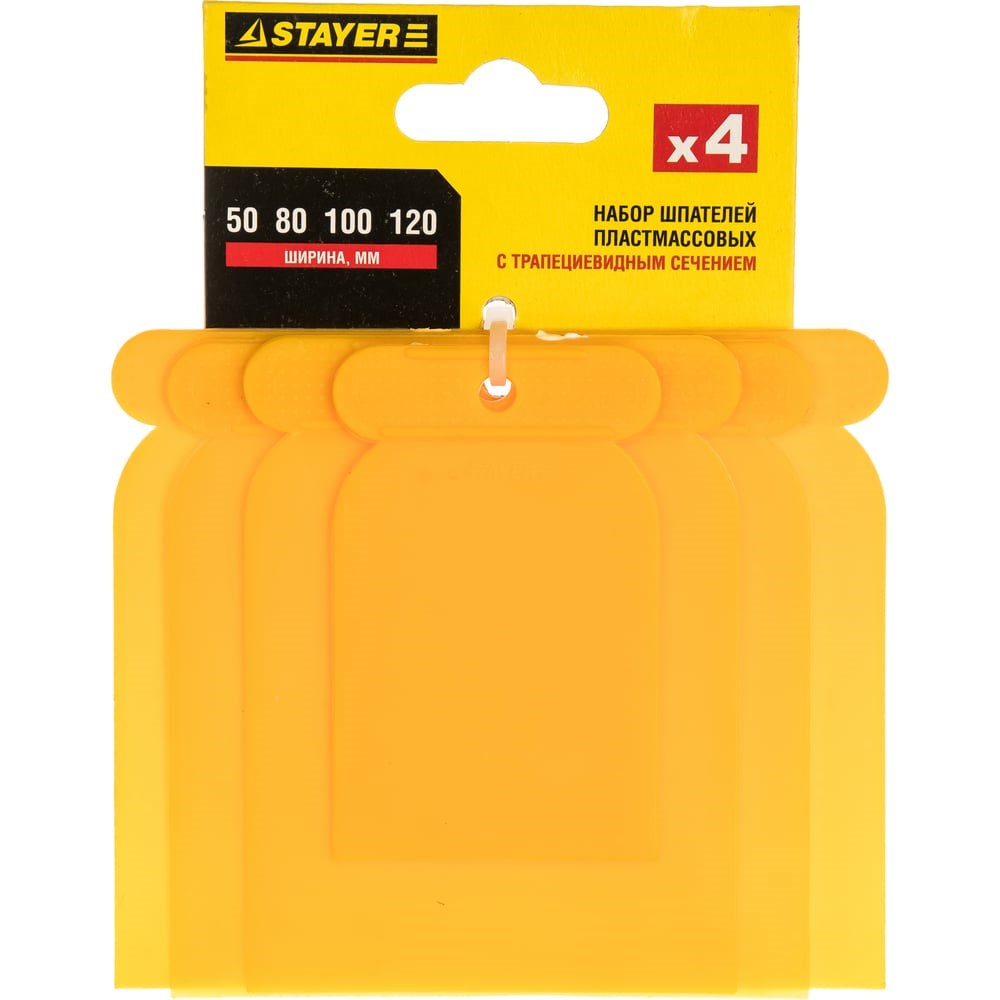 Набор поверхностных шпателей STAYER Япончик 4шт: 50, 80, 100, 120мм 1010-H4 - комплект инструментов, сделанных из пластмассы. С помощью данных шпателей вы сможете выполнять работы со шпатлевкой в труднодоступных местах.