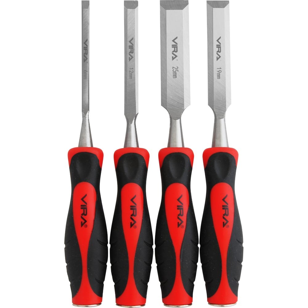 Набор плоских стамесок VIRA 4 шт: 6, 12, 19, 25 мм. 811044 предназначены для выполнения столярных и слесарных работ. Инструменты оснащены удобными двухкомпонентными рукоятками, которые не скользят в руке мастера во время работы. Рабочая часть выполнена из хром-ванадиевой стали.