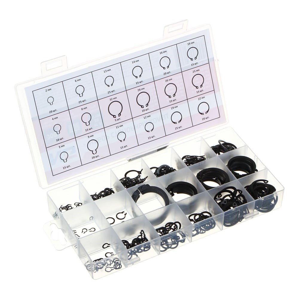 Набор стопорных колец 300 предметов в размерах 2 - 32 мм имеет в своем комплекте изделия, которые служат для предотвращения смещения деталей относительно друг друга. Стопорные кольца выполнены из прочной стали. Кейс из пластика служит для хранения и компактной транспортировки.