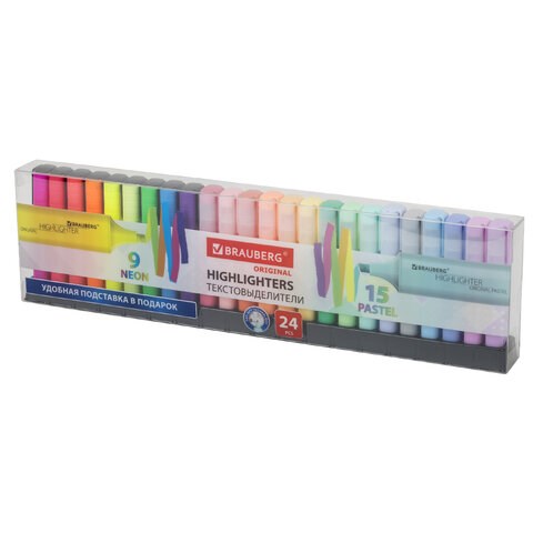 Набор текстовыделителей 24 ЦВЕТА на подставке, BRAUBERG "ORIGINAL", 15 пастельных цветов + 9 неоновых цветов, линия 1-5 мм, 152508