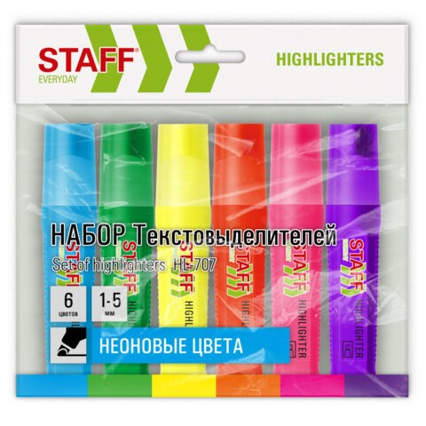Набор текстовыделителей 6 НЕОНОВЫХ ЦВЕТОВ, STAFF "EVERYDAY HL-707", линия 1-5 мм, скошенный наконечник, 152550