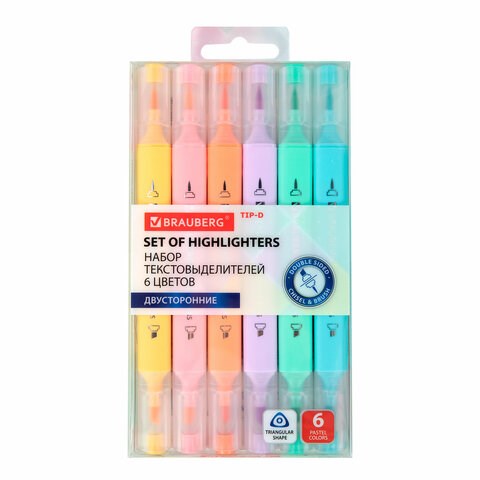 Набор текстовыделителей двусторонних (скошенный/кисть) 6 ПАСТЕЛЬНЫХ ЦВЕТОВ, АССОРТИ, BRAUBERG TIP-D, трехгранный корпус, 152533