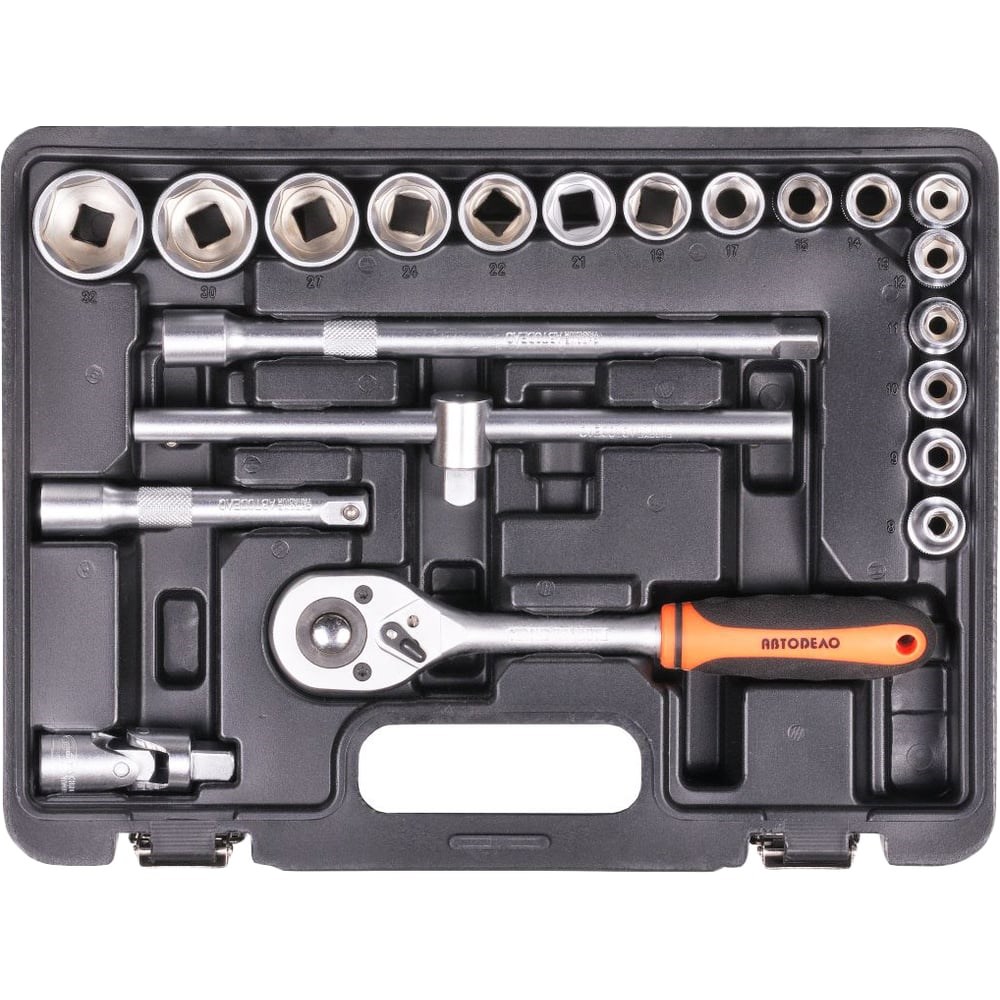 Набор торцевых головок АвтоDело 1/2" DR 21 предмет 39821 13683 предназначен для ремонта автотранспорта. Особенности модели: комплектующие изготовлены методом горячей штамповки из высокопрочной стали; головки с шестигранным профилем; корпус закален до твердости 39 HRC; Т-образный вороток размером 250 мм; трещоточный механизм имеет 45 зубьев и обеспечивает поворот ключа на 8 градусов. В комплекте предусмотрены торцевые головки, ключи с присоединительными квадратами 1/2 дюйма, кардан и удлинители. Набор поставляется в удобном пластиковом кейсе для удобного хранения и транспортировки.
