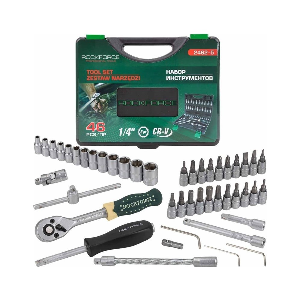 Набор инструментов Rockforce из 46 предметов — это идеальный комплект, предназначенный для слесарных, монтажных и ремонтных работ, особенно при обслуживании автомобилей. Каждый элемент набора разработан с учетом удобства и практичности, что делает его незаменимым помощником в различных ситуациях.Преимущества набора RockFORCE:Широкая комплектация: В набор входят 46 предметов, включая:6-гранные головкиГоловки-биты различных типов (HEX, TORX, SL, PH, PZ)ТрещоткаУсиленный воротокУдлинители и карданБлагодаря такой разнообразной комплектации, вы сможете решать широкий спектр задач.Качество материалов: Все инструменты изготовлены из хромвандиевой стали, что обеспечивает их тепловую и ударную устойчивость, а также долговечность. Это гарантирует длительный срок службы и надежность в работе.Удобная маркировка: Все головки в кейсе помечены, что упрощает выбор нужного размера инструмента и делает процесс работы более эффективным.Компактный кейс: Все инструменты помещаются в прочный пластиковый кейс небольшого размера, что позволяет удобно хранить его в автомобиле или гараже. Набор легко взять с собой на выездные работы.Посадочный квадрат 1/4 дюйма: Этот стандартный размер подходит для работы с автомобилями и позволяет решать любые сложные задачи.Применение набора:Автомобильные работы: Набор незаменим для мелкого ремонта и обслуживания автомобиля. Он подходит для таких задач, как замена свечей, подтяжка болтов и другие работы.Ремонт и монтаж: Используйте набор для различных домашних и строительных работ. Удлинители и кардан помогут достать до труднодоступных мест.Бытовые задачи: Инструменты из набора идеально подходят для повседневного использования, включая сборку мебели, установку полок или монтаж электрики.Заключение:Набор инструментов Rockforce из 46 предметов — это надежное и практичное решение для выполнения множества задач, как в профессиональной деятельности, так и в быту. С его помощью вы сможете легко и быстро справляться с любыми ремонтными и монтажными работами.
