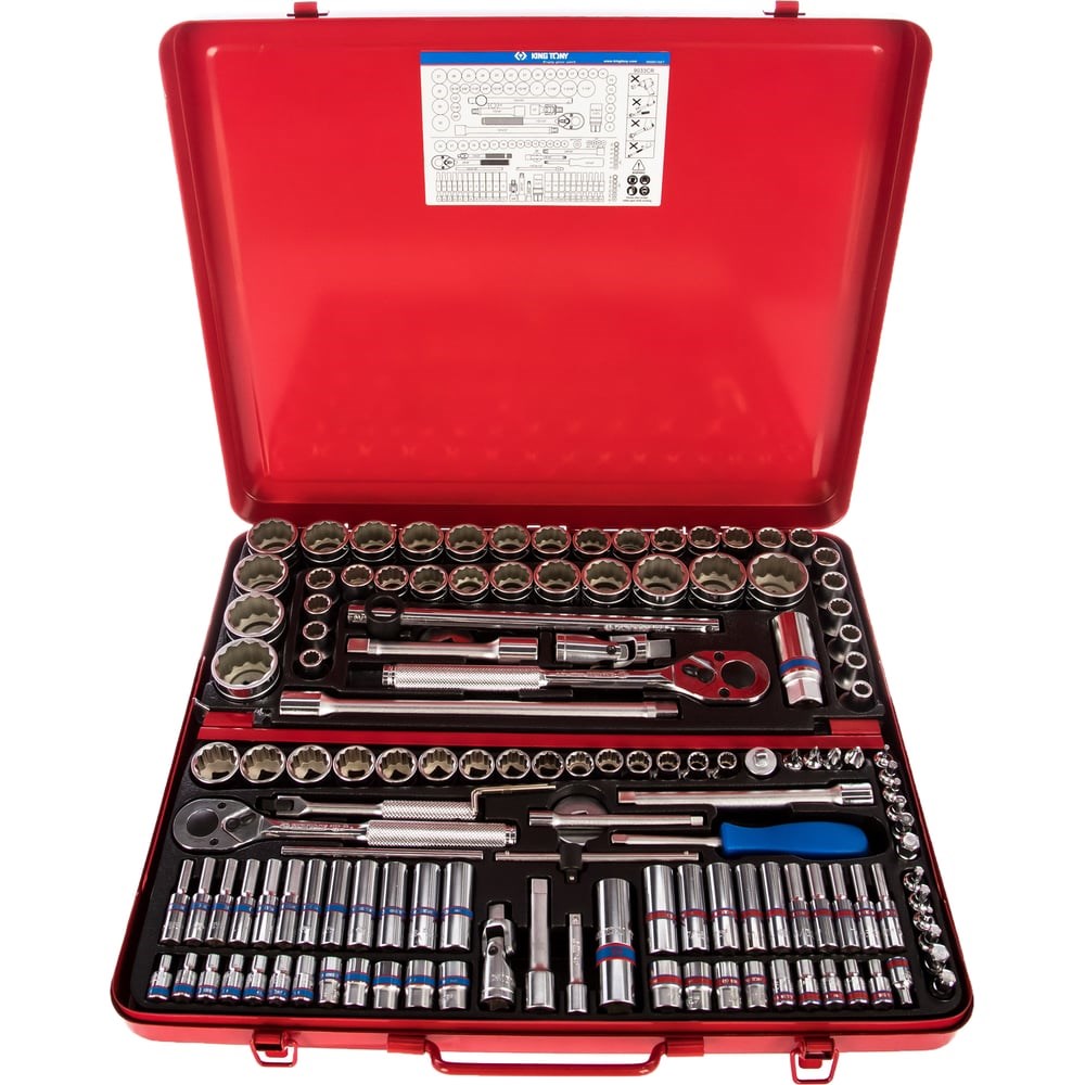 Набор торцевых головок с принадлежностями (1/4"&3/8"&1/2", двенадцатигранные, 4-32 мм, 5/32"-1&1/4", 135 предметов) KING TONY 9033CR включает в себя большое количество оснастки и ручного инструмента для удобства монтажа и демонтажа резьбовых креплений. Посадочный размер головок составляет 1/4, 1/2 и 3/8 дюйма. Вес комплекта - 11.55 кг.