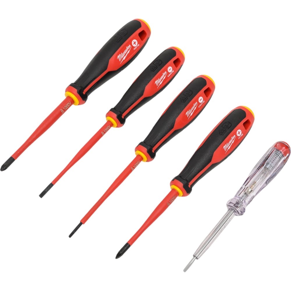 Набор трехгранных отверток Milwaukee VDE PZ/SL + тестер напряжения - 5 ед. 4932478737 позволяет работать практически с любой электроникой. Удобные рукоятки не скользят и не проворачиваются. Это позволяет эффективно вращать тугой крепеж. Для проверки наличия напряжения в сети есть тестер. Это упрощает работу и делает процесс более безопасным.