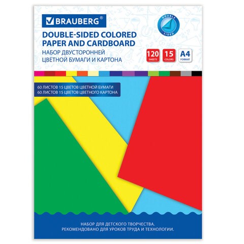 Набор цветного картона и бумаги А4 ТОНИРОВАННЫХ В МАССЕ, 60+60 л., 15 цв., BRAUBERG, "Творчество", 115088