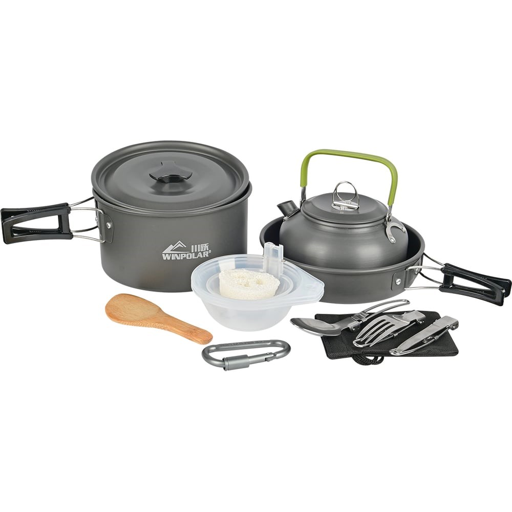 кастрюля - 1шт, чайник - 1шт, сковорода - 1шт, пластмассовые тарелки - 3шт, складной пластмассовый половник - 1шт, губка - 1шт, деревянная лопатка - 1шт, складные столовые приборы (вилка, ложка, нож) по 1шт